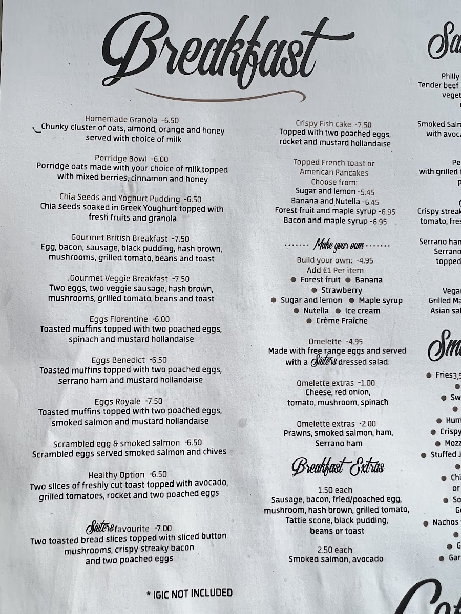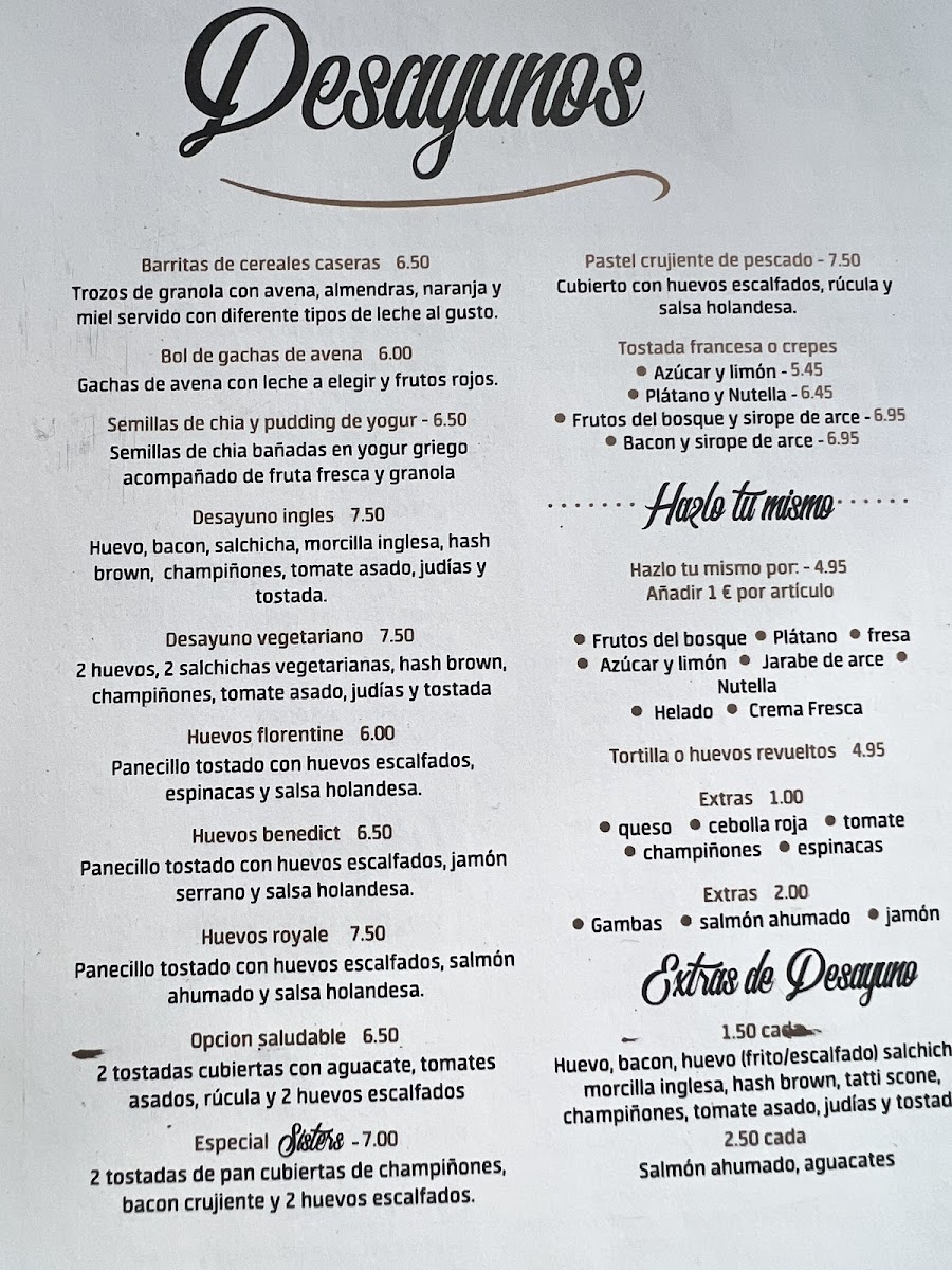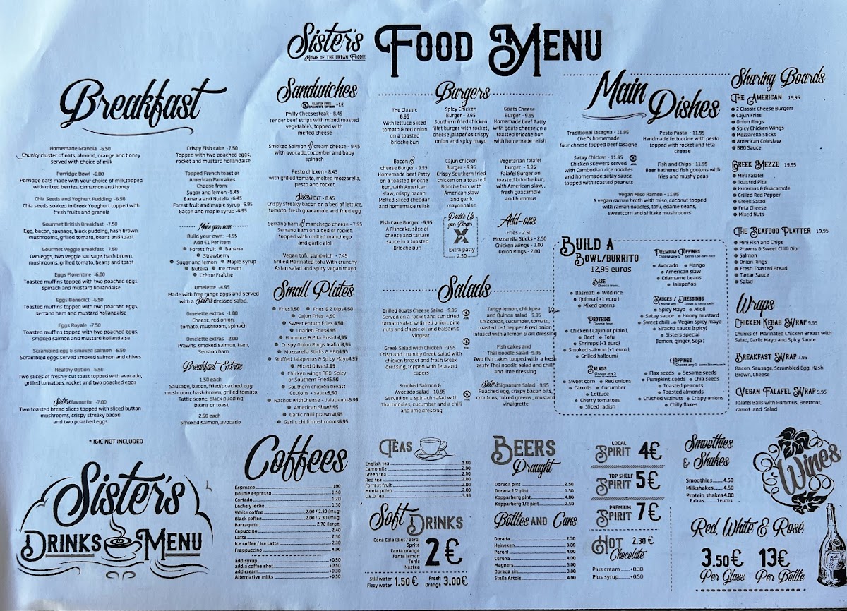 Sisters Coffee Shop And Kitchen offers a delightful and varied menu that caters to a wide range of tastes. The breakfast and brunch options are particularly noteworthy, with standout dishes such as the Eggs Benedict, a perfect combination of poached eggs, creamy hollandaise sauce, and savory ham, making it a must-try for any brunch lover. For a lighter, healthier choice, the Fish Cakes with Poached Eggs offer a delightful blend of fresh ingredients, while the Falafel provides a flavorful vegetarian option, ideal for those seeking a plant-based meal. Coffee enthusiasts will appreciate the café's range of beverages, including the unique Non Alcoholic Barraquito Coffee, which offers a refreshing twist on the classic Canary Islands coffee, and the creamy Flat White with Soya Milk, a perfect choice for those looking for a dairy-free alternative. To finish off your meal on a sweet note, the homemade Carrot Cake is an excellent dessert option, rich in flavor and the perfect way to end a meal. Whether you're in the mood for a filling breakfast or a light snack, Sisters Coffee Shop And Kitchen offers something for everyone, with quality ingredients and flavorful dishes that make each visit a memorable one.